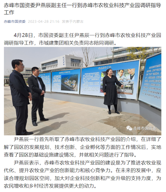 赤峰市國(guó)資委尹燕辰副主任一行到赤峰市農(nóng)牧業(yè)科技產(chǎn)業(yè)園調(diào)研指導(dǎo)工作